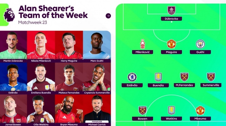 1月28日讯 英超第23轮战罢,阿兰·希勒评选本轮最佳阵容,马奎尔、格伊、埃斯特旺、姆伯莫在列。